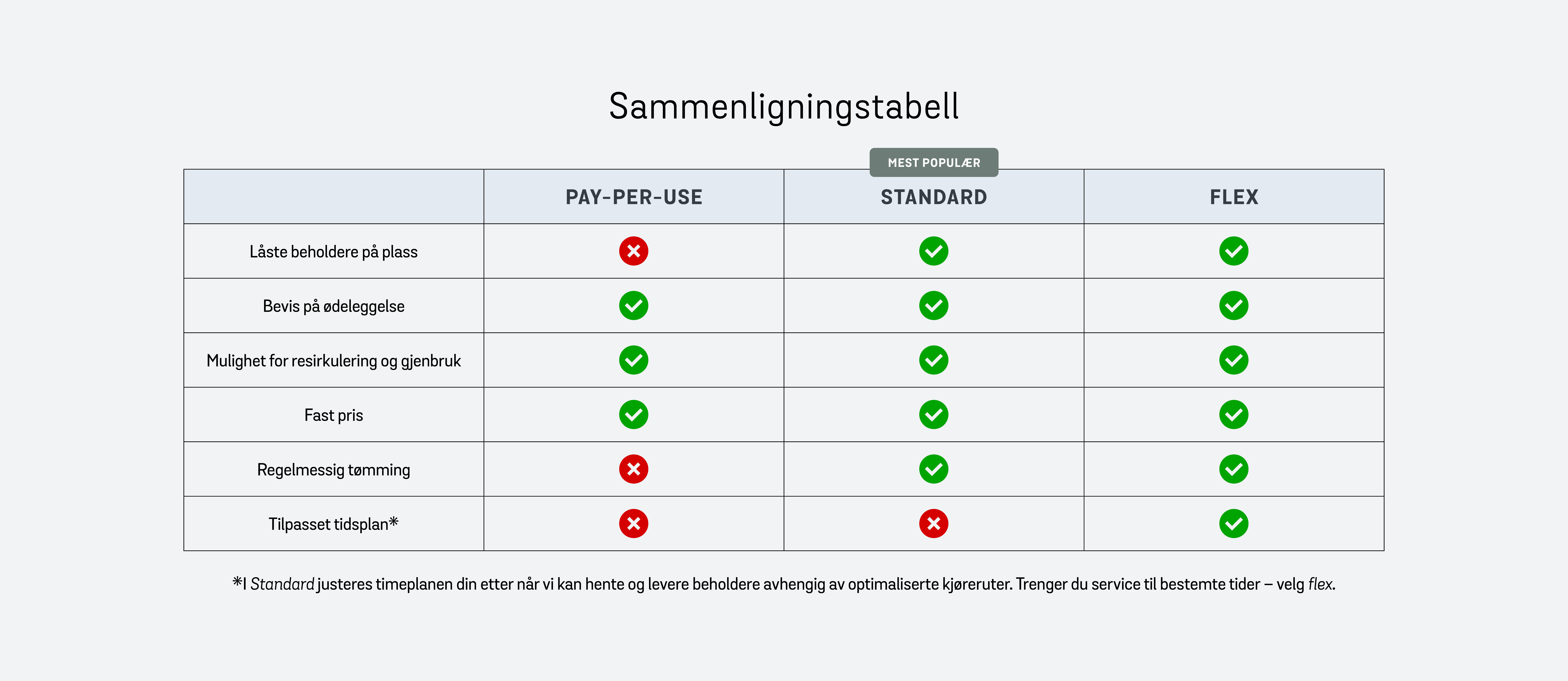 Ved hjelp av vår sammenligningstabell får du et klart og forståelig bilde av hvordan våre ulike tilbud henger sammen. Ved å ta en titt på denne tabellen kan du enkelt se hvilke alternativer som passer best for dine behov og preferanser. Finn den perfekte løsningen for deg!